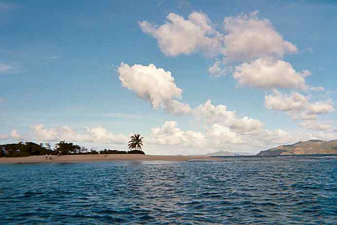 The fourth morning we were off - motoring in light winds for most of daylight across the last of the bank with no real land in sight. Finally, we crossed a 20 foot shallow of very white sand, making the water color a light aqua. At 40 feet, the water was a deep aqua. By 60 feet, the water was beyond blue to indigo. The next time I looked, we were off the banks beyond depth sounder range, and the water was absolutely purple. This is the first time I had seen deep, clear water known to sailors as "blue water". It was a beautiful reminder that we were now in serious ocean.